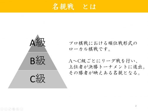 ママパパ将グループ棋戦において、最も主軸である棋戦である「第3期名親戦」がついに始まります。簡単に言えば、日本将棋連盟のプロ棋士たちが1年通して戦っている順位戦形式の棋戦です。